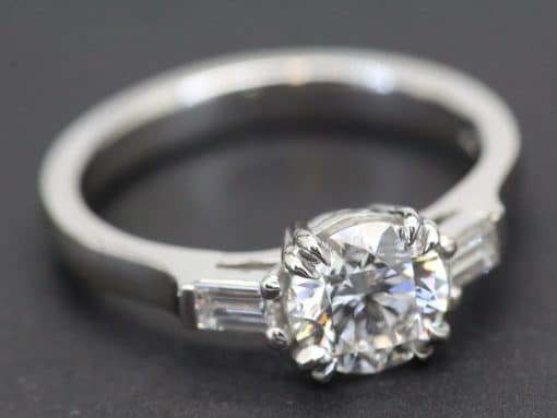 Superb platinum diamond ring, centered on a 1.2ct E colour diamond, GIA certed triple excellent cut, with baguette shoulders. Finger size N, we can adjust to fit any finger.