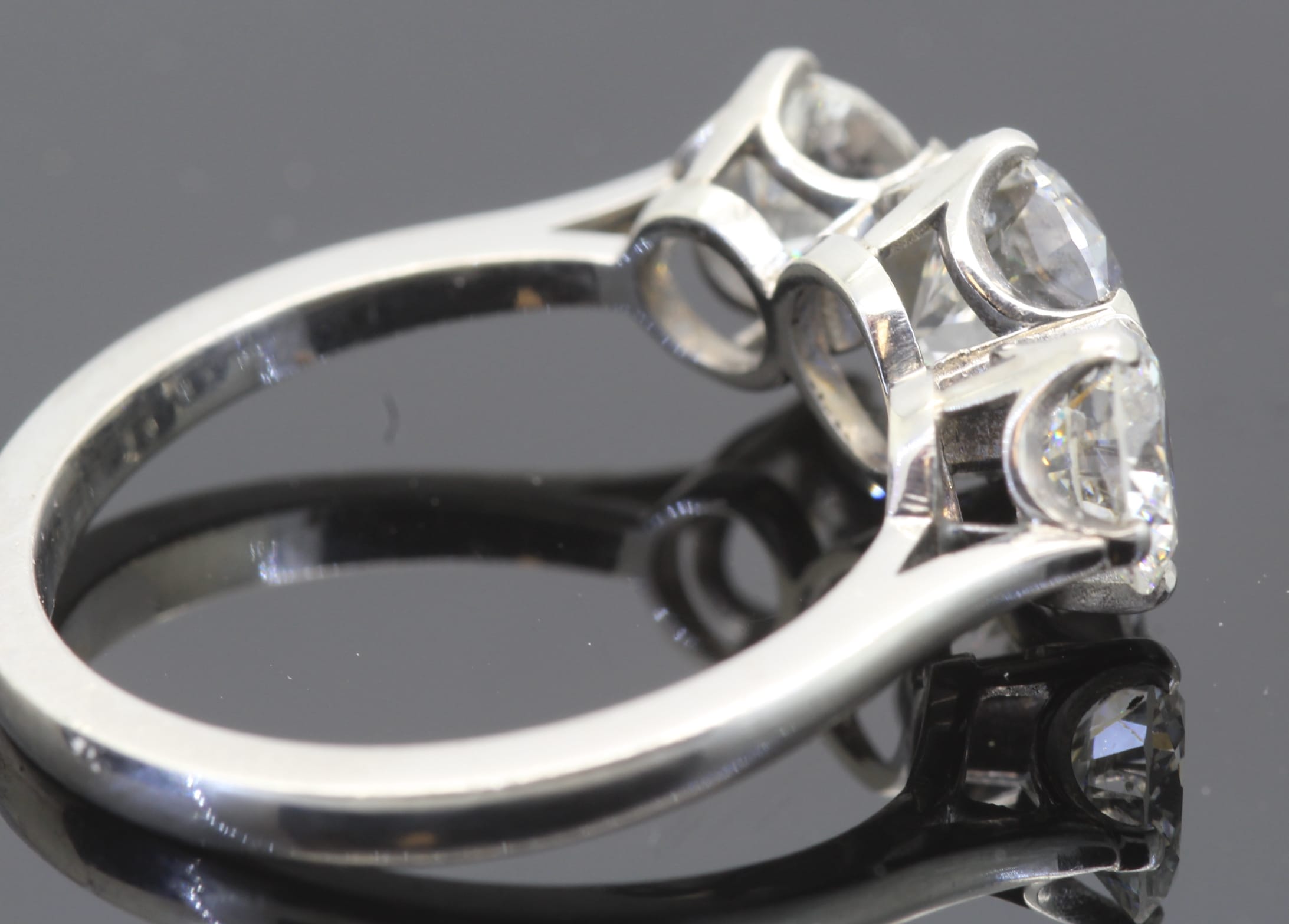 Contemporary diamond three stone ring, claw set on platinum. Set with three brilliant cut diamonds, 1.1ct centre and two 0.5ct sides. H colour and SI1 clarity. Finger size L, we can adjust to fit any finger.