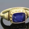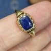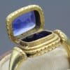 This is an early Victorian poison ring, made from gold, circa 1840. Set with a natural unheated Kashmir sapphire in the hinged lid. The body of the container with elegant wirework, to a broad, tapering shank.