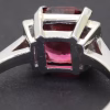 Contemporary pink tourmaline and diamond ring, set on platinum. Centered on a 2.3ct tourmaline, with baguette shoulders. Finger size N 1/2, we can adjust to fit any finger.