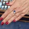 Vintage sapphire and diamond ring, set with a 0.8ct diamond (G/H colour and VS clarity) and 1ct sapphire. Finger size O, we can adjust to fit any finger.