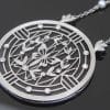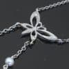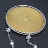 Exceptional enamel, pearl and diamond pendant, circa 1925. The black enamel circular disc is 3.5cm across, openwork with diamonds, centered on a butterfly motif. Suspended from a short chain with butterfly junction. Set on a long platinum chain with pearls, 21.5 inches. Gold backed with engine turning. A simply gorgeous piece of jewellery.